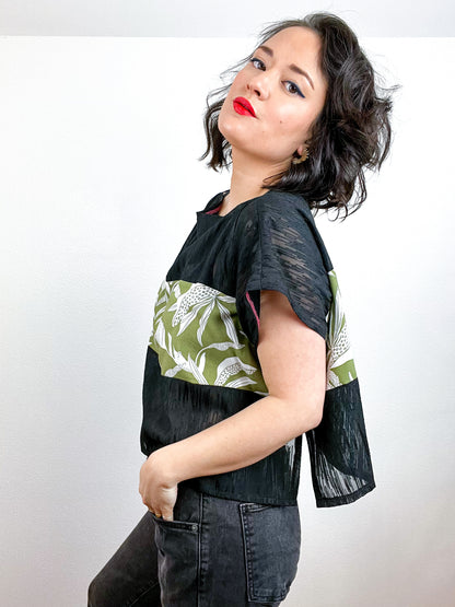Scrappy crop top with sheer textured black chiffon upper and lower and green leaves print center. High boat neckline, side slits, wide flouncy fit, contrast pink stitching.