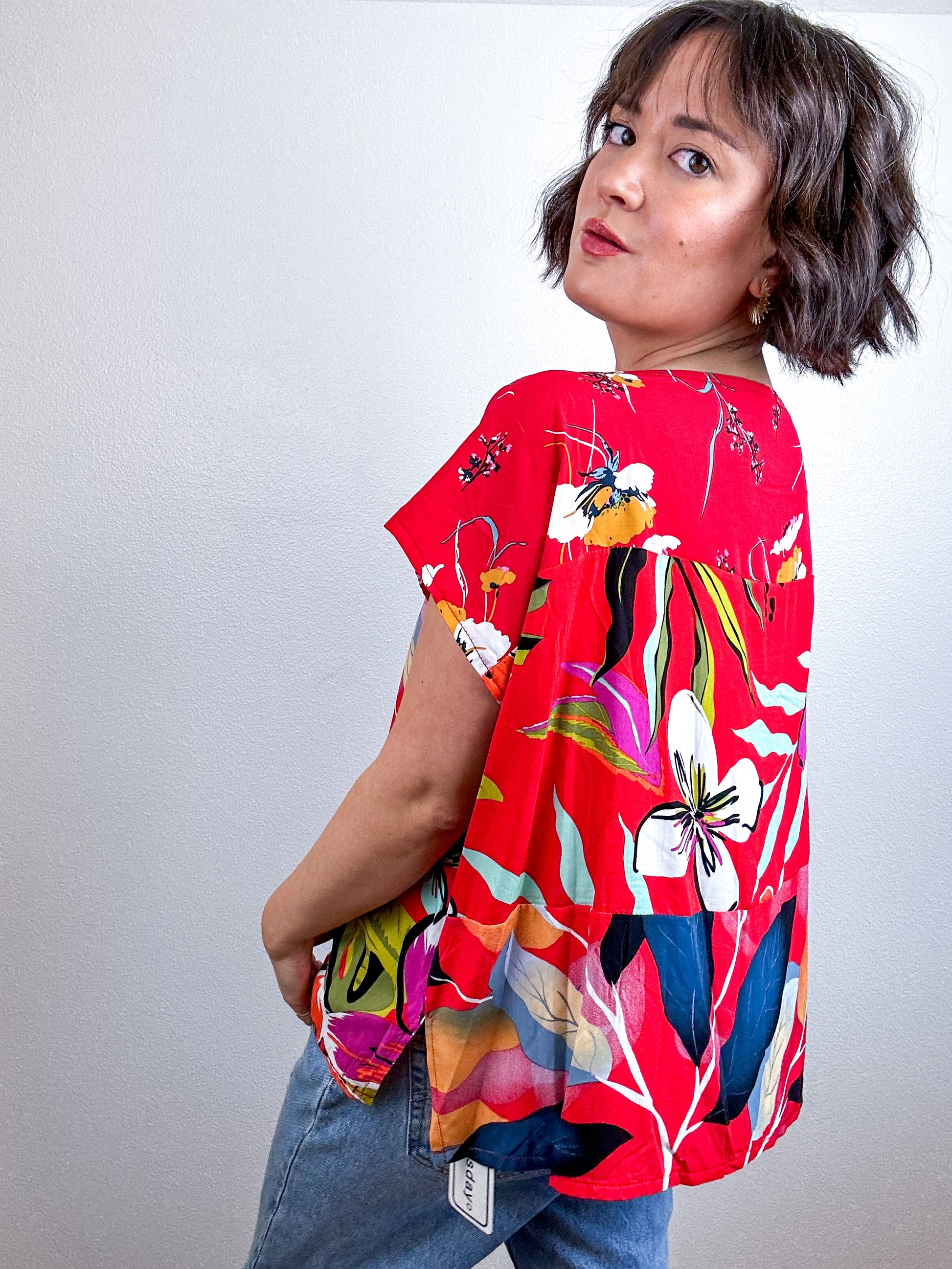 Scrappy crop top with 3 layered prints. High boat neckline, side slits, wide flouncy fit, flippable design.