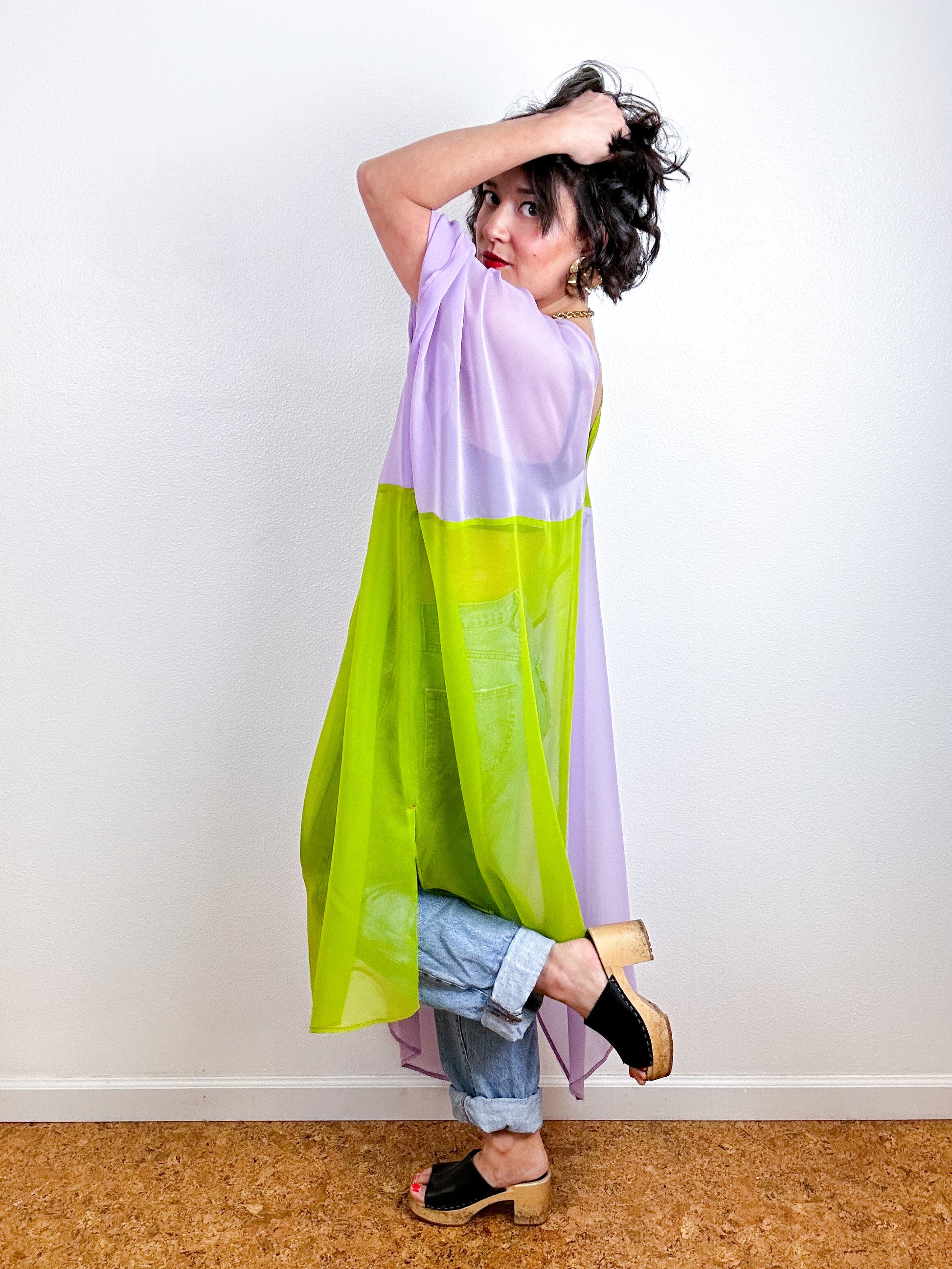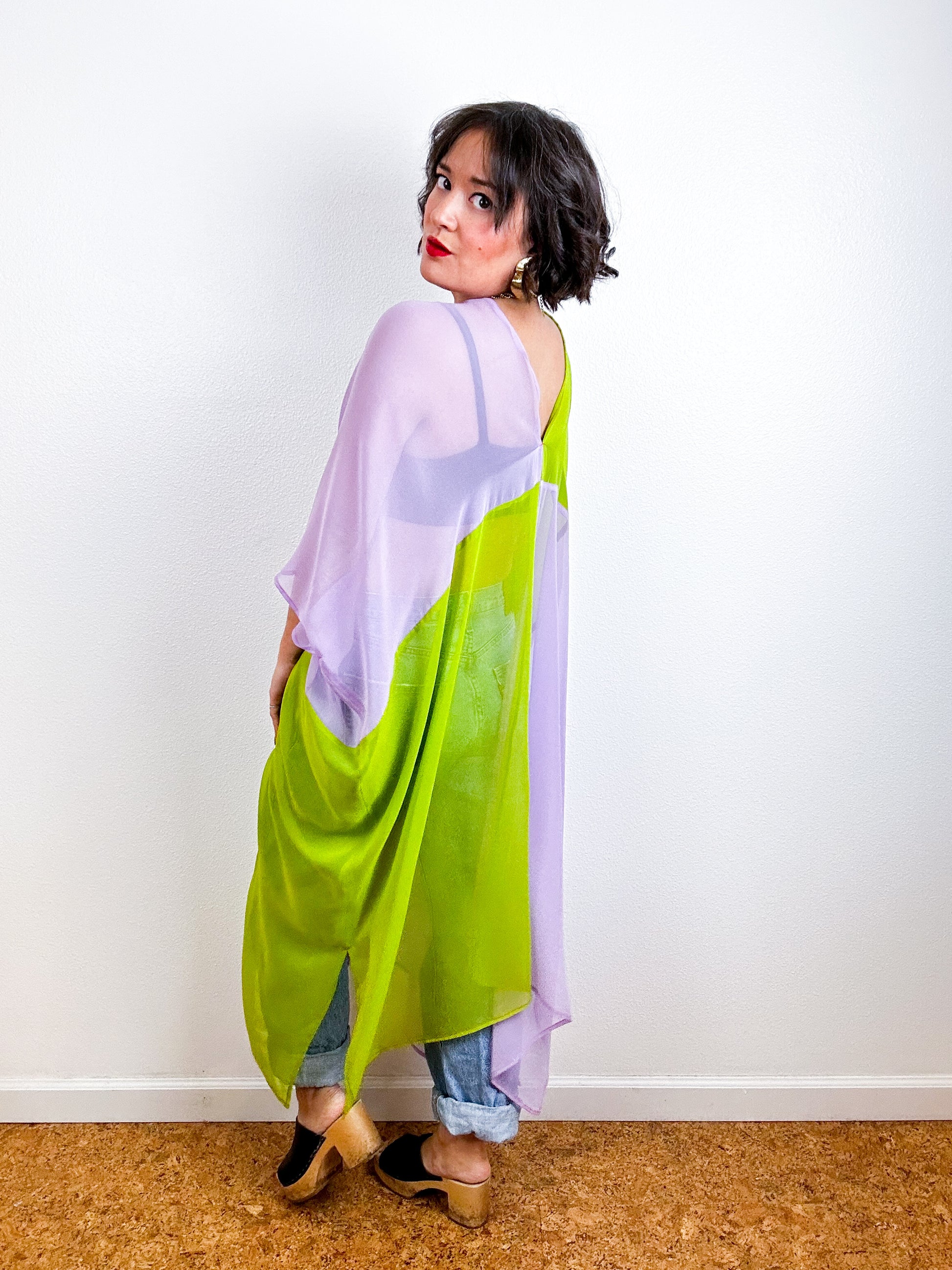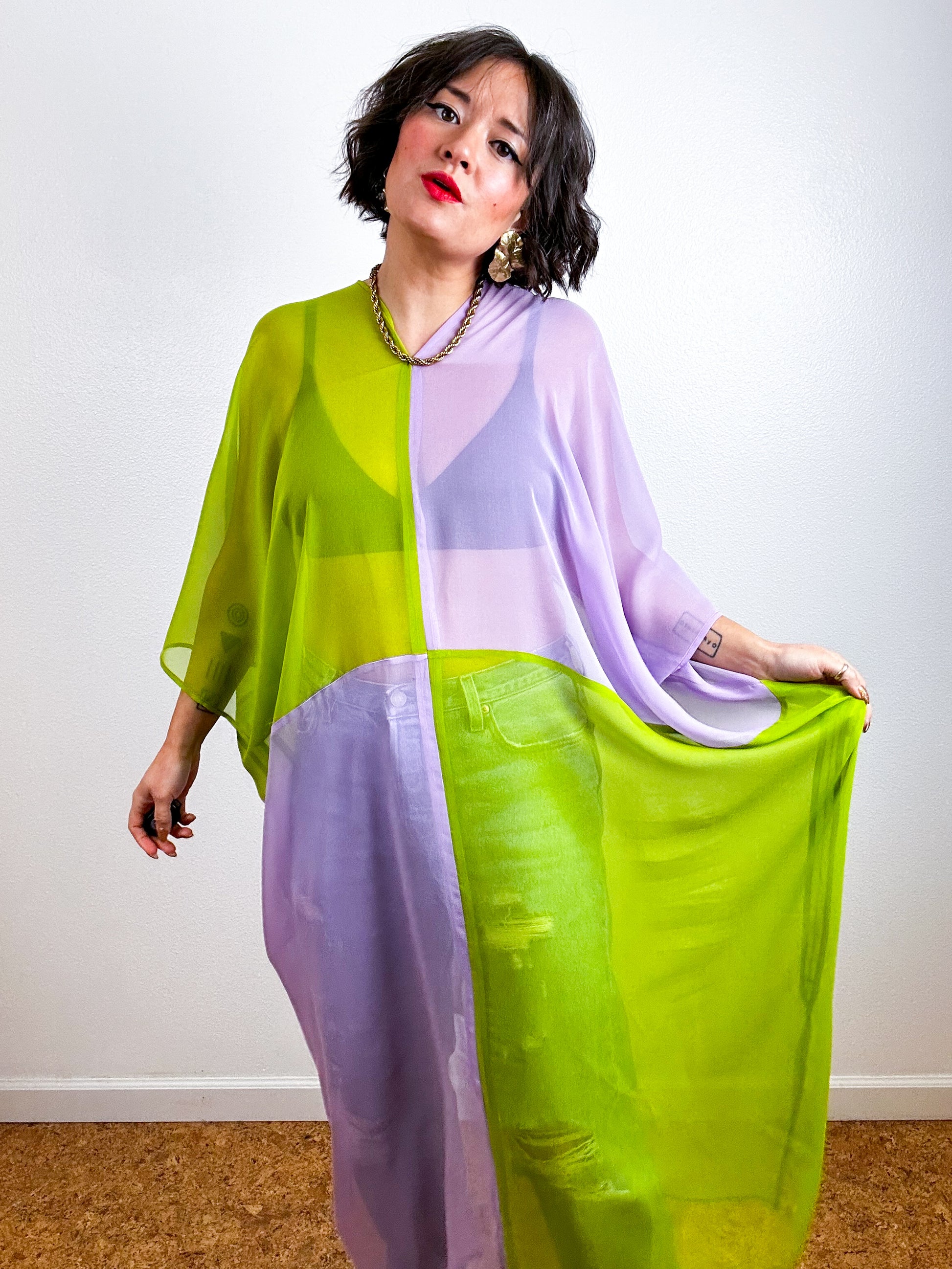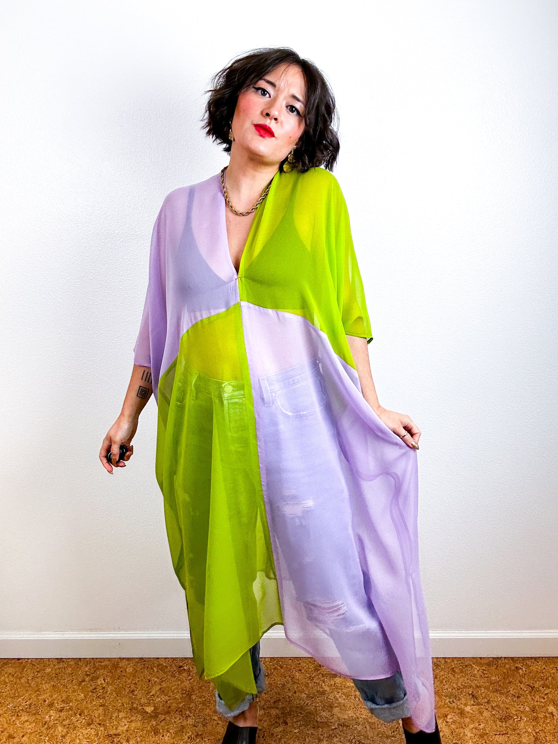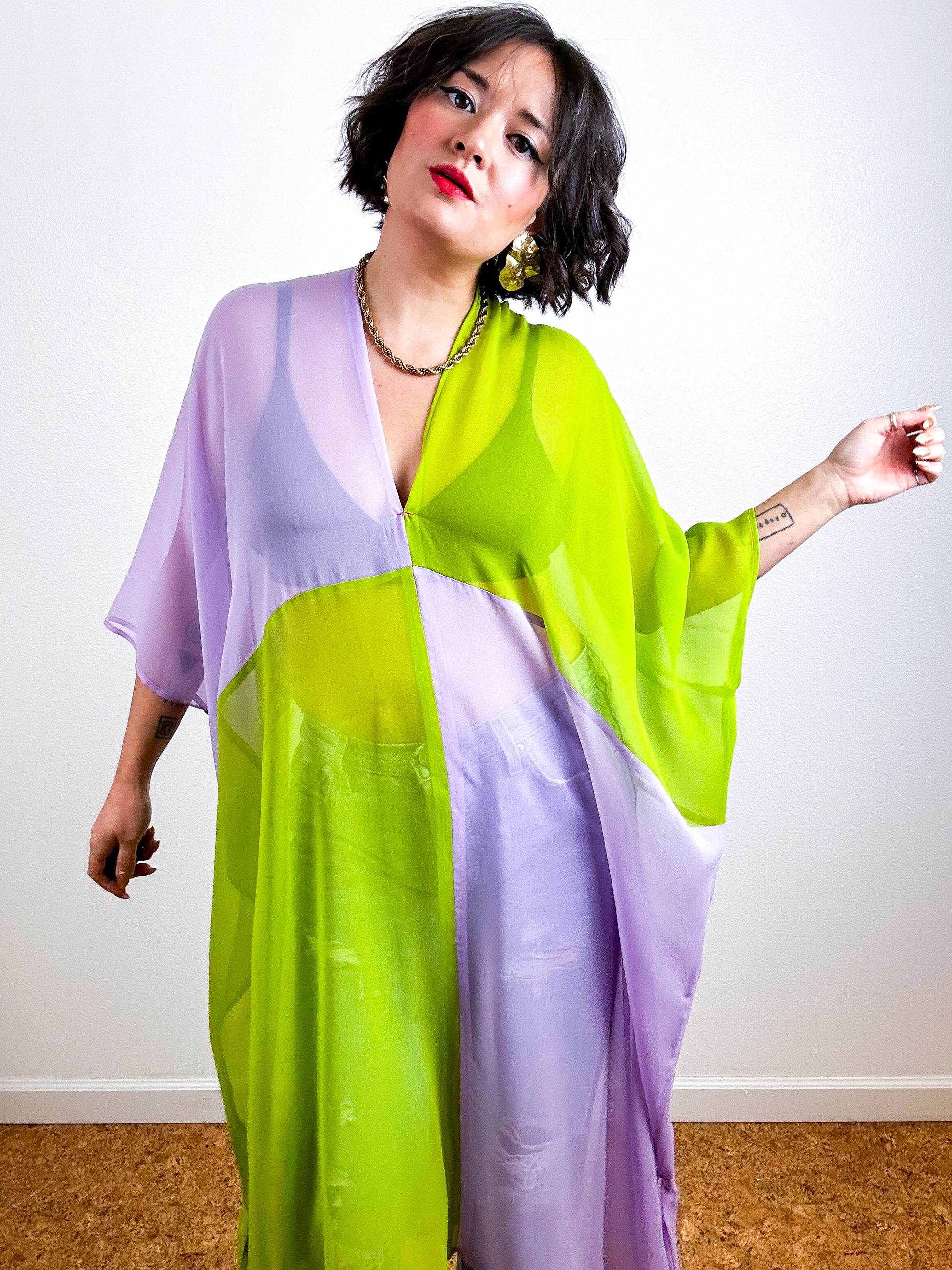 100% silk chiffon color block caftan dress with an oversized silhouette, midi length, side slits and french seam details. Can be flipped for a high neck/low back style. Minimalist design created from full rectangles of fabric produces zero material waste. Sheer 100% silk chiffon fabric in chartreuse and lavender dye.
