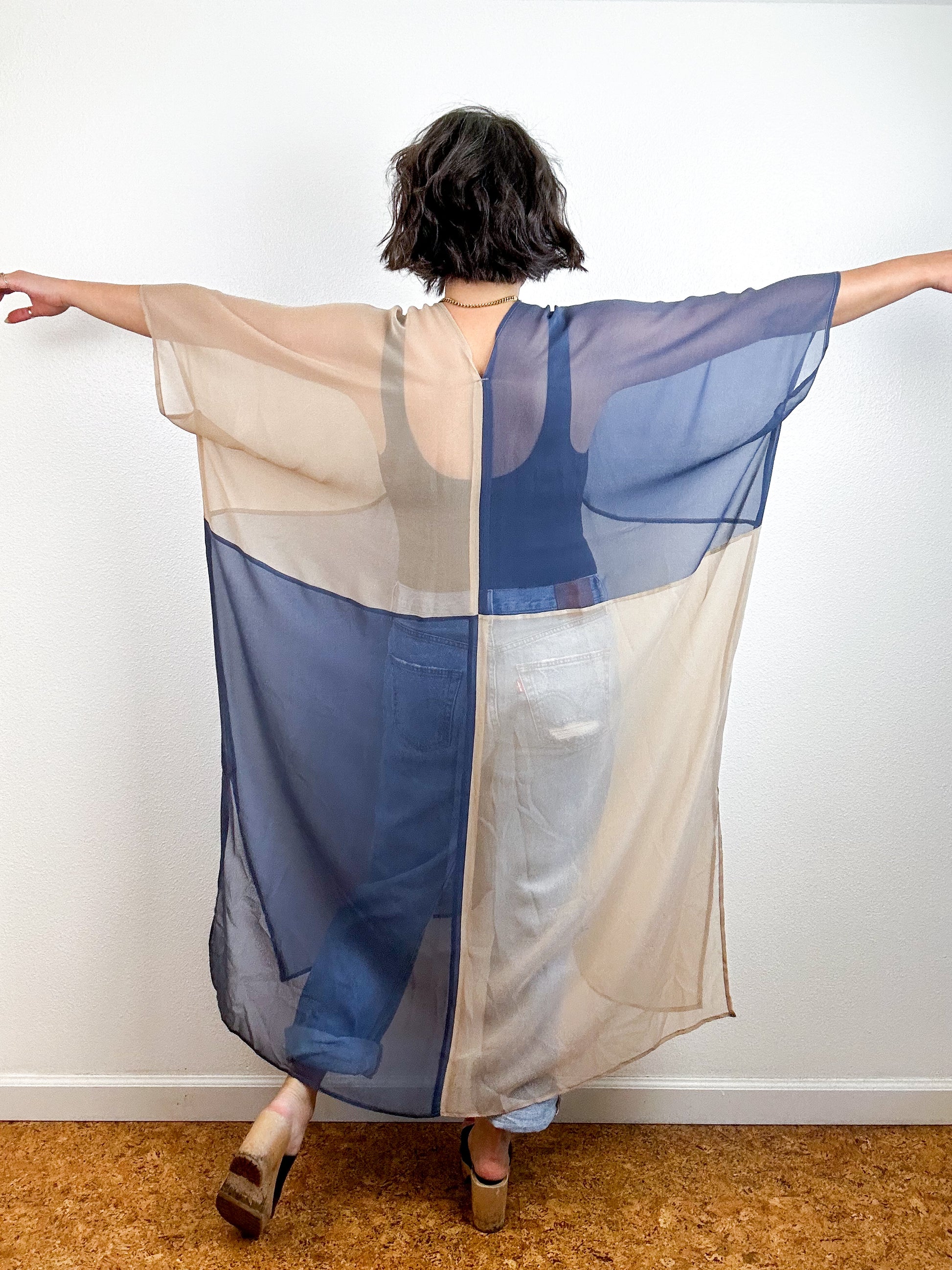 100% silk chiffon color block caftan dress with an oversized silhouette, midi length, side slits and french seam details. Can be flipped for a high neck/low back style. Minimalist design created from full rectangles of fabric produces zero material waste. Sheer 100% silk chiffon fabric in fawn and steel grey dye.