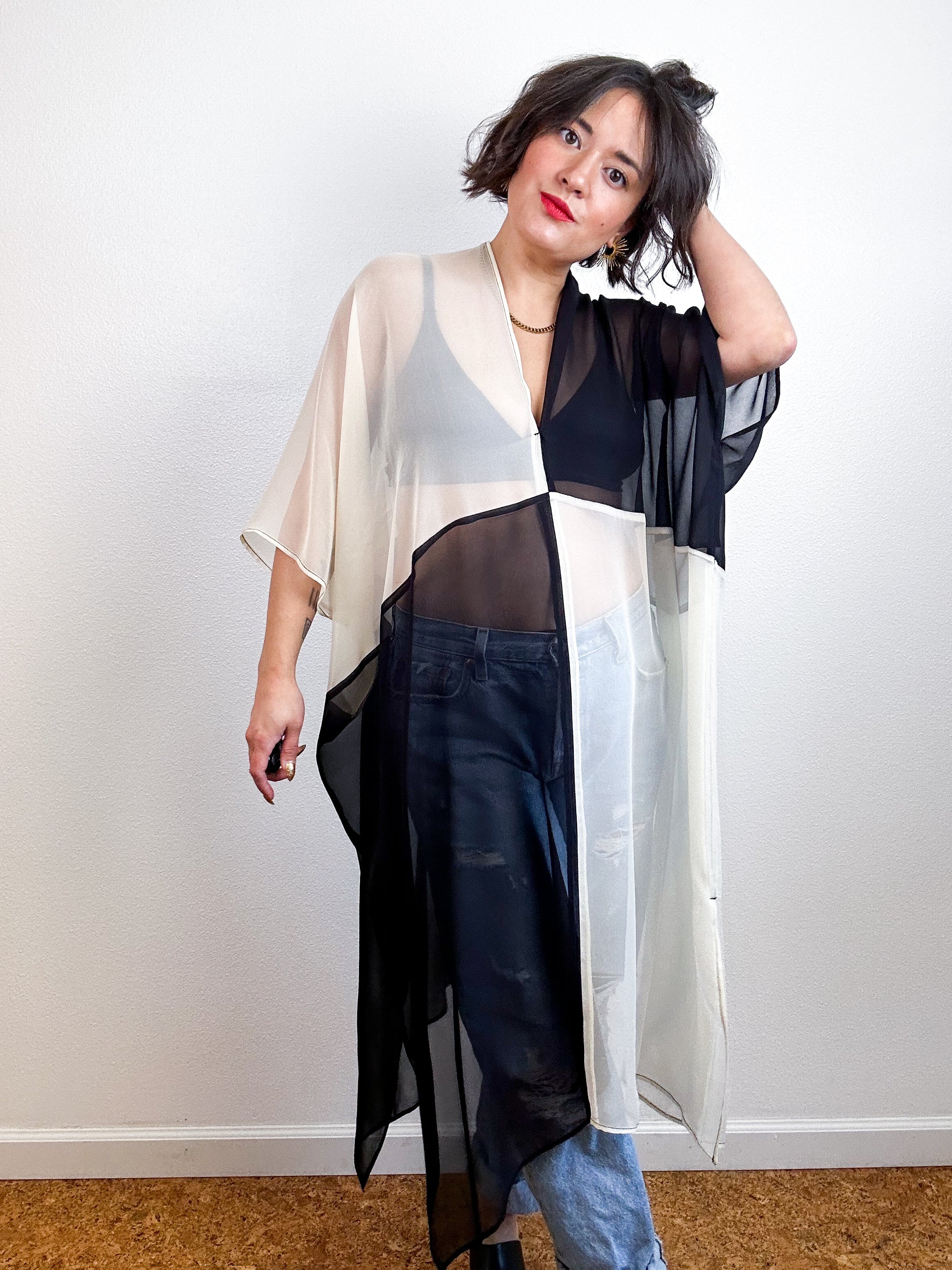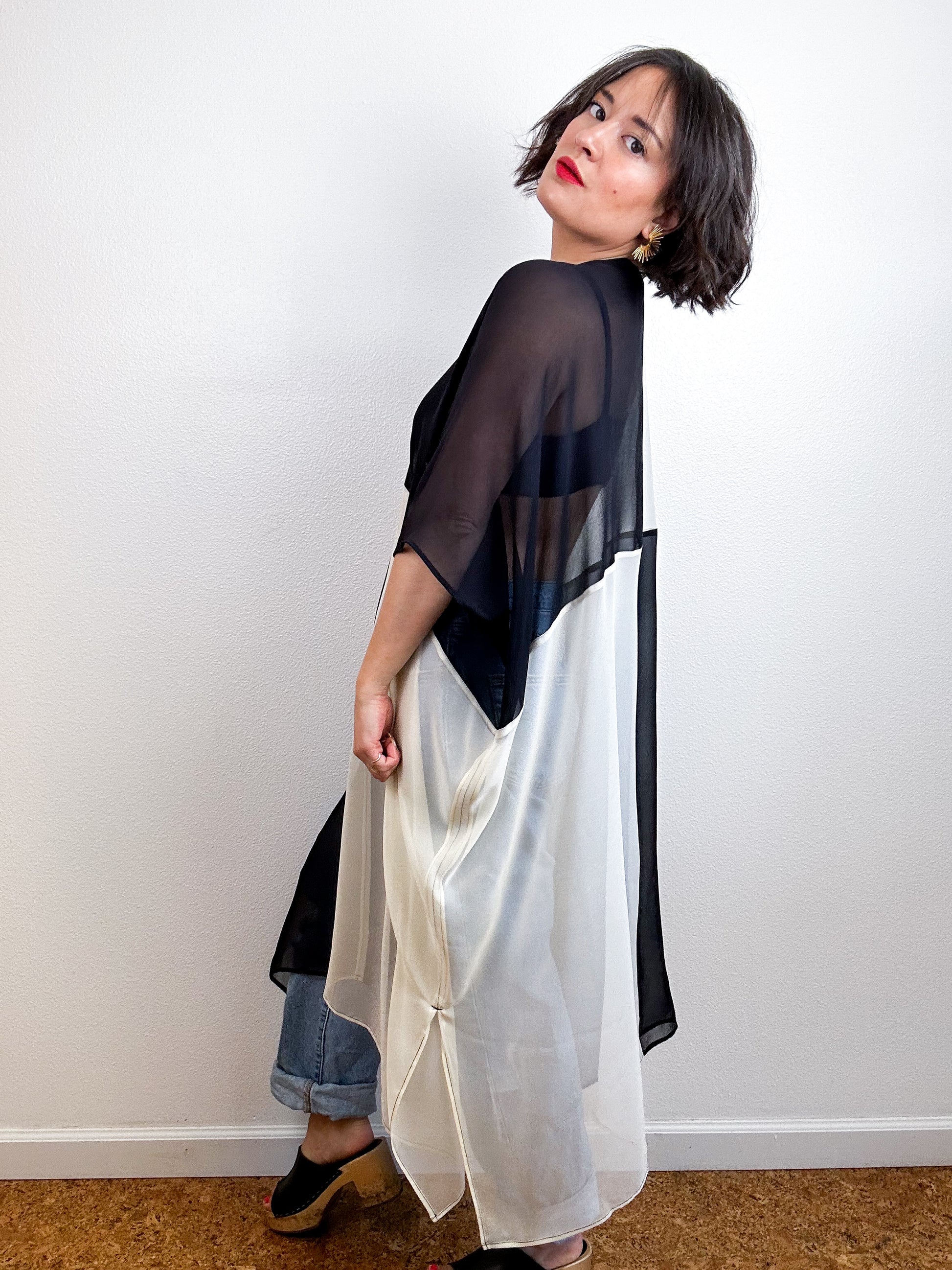 100% silk chiffon color block caftan dress with an oversized silhouette, midi length, side slits and french seam details. Can be flipped for a high neck/low back style. Minimalist design created from full rectangles of fabric produces zero material waste. Sheer 100% silk chiffon fabric in ivory and black dye.