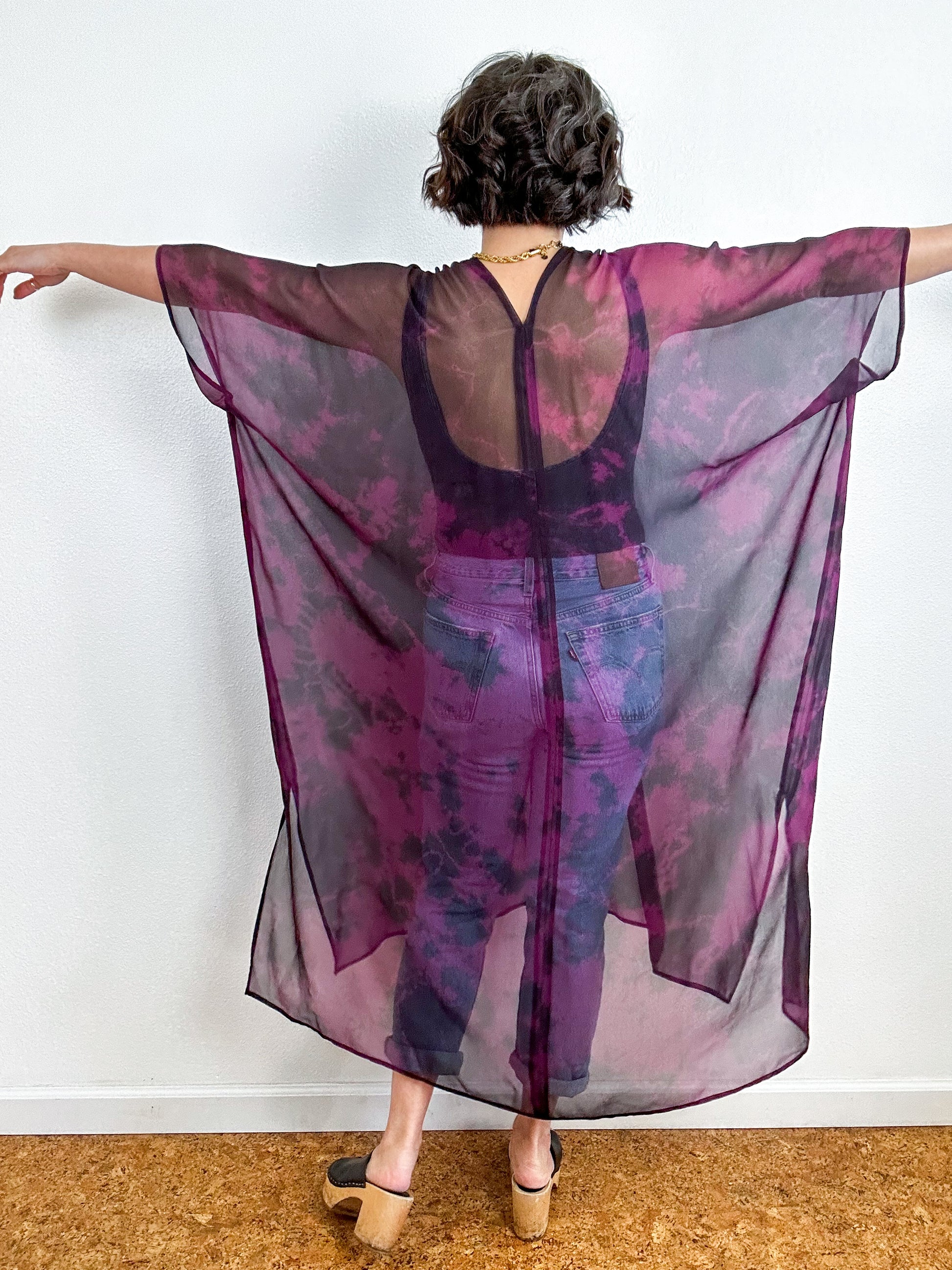 100% silk chiffon caftan dress with an oversized silhouette, midi length, side slits and french seam details. Can be flipped for a high neck/low back style. Minimalist design created from full rectangles of fabric produces zero material waste. Sheer 100% silk chiffon fabric in maroon and black tie dye.