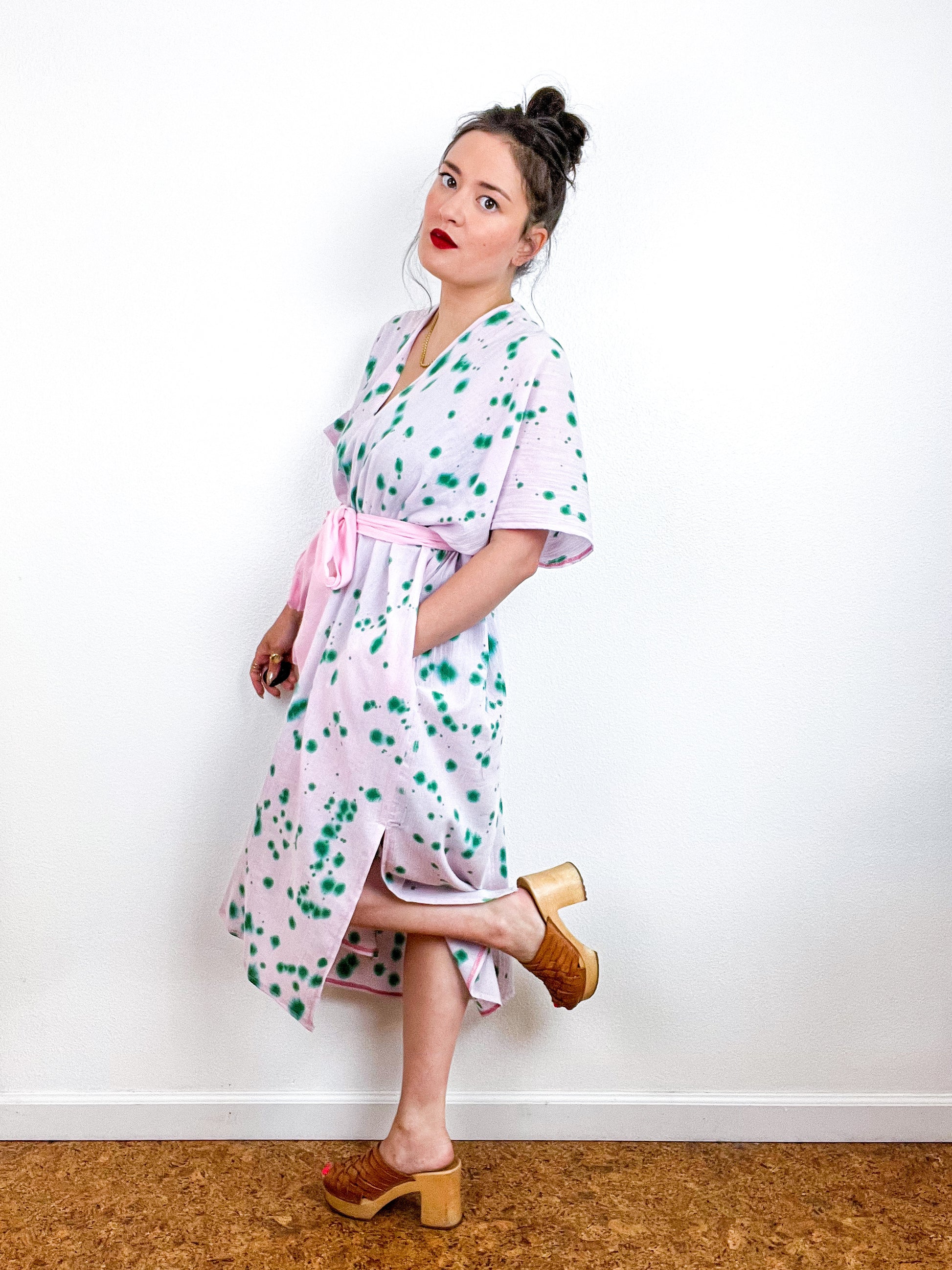 Single gauze caftan dress with an oversized silhouette, midi length, side slits and nice deep pockets. Can be worn with included tie for a defined waist, or without for a more comfy look. Versatile shape can be styled as a dress or tunic over jeans or leggings. The minimalist design created from full rectangles of fabric produces little to no material waste. Lightweight 100% cotton single gauze fabric is hand-dyed blush pink with green speckles.