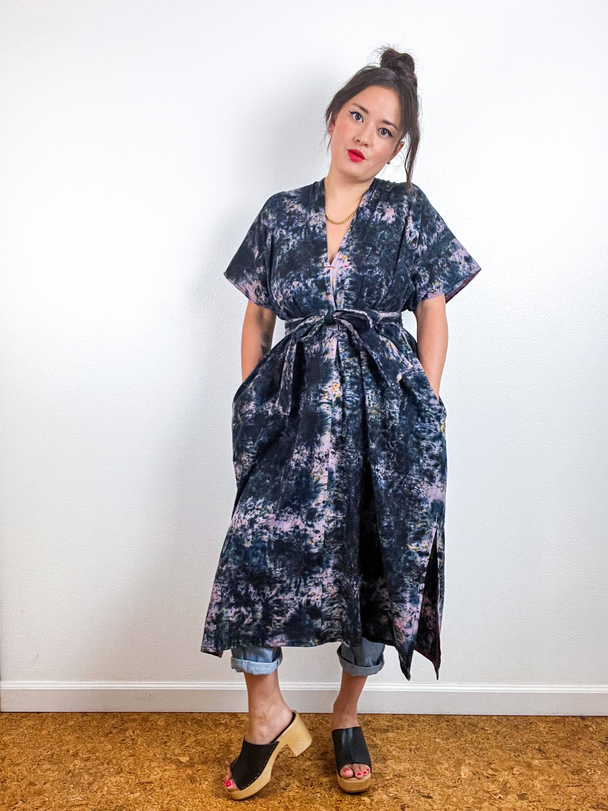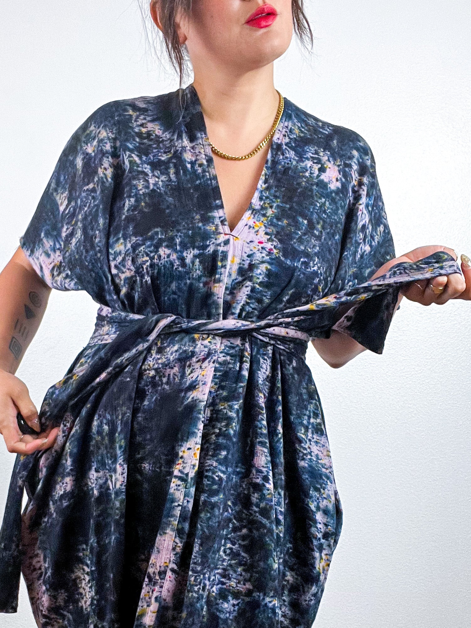 Single gauze caftan dress with an oversized silhouette, midi length, side slits and nice deep pockets. Can be worn with included tie for a defined waist, or without for a more comfy look. Versatile shape can be styled as a dress or tunic over jeans or leggings. The minimalist design created from full rectangles of fabric produces little to no material waste. Lightweight 100% cotton single gauze fabric is hand-dyed in a multicolor speckle print using an original technique, capturing each pigment that combines to create the color black the moment it touches the fabric.