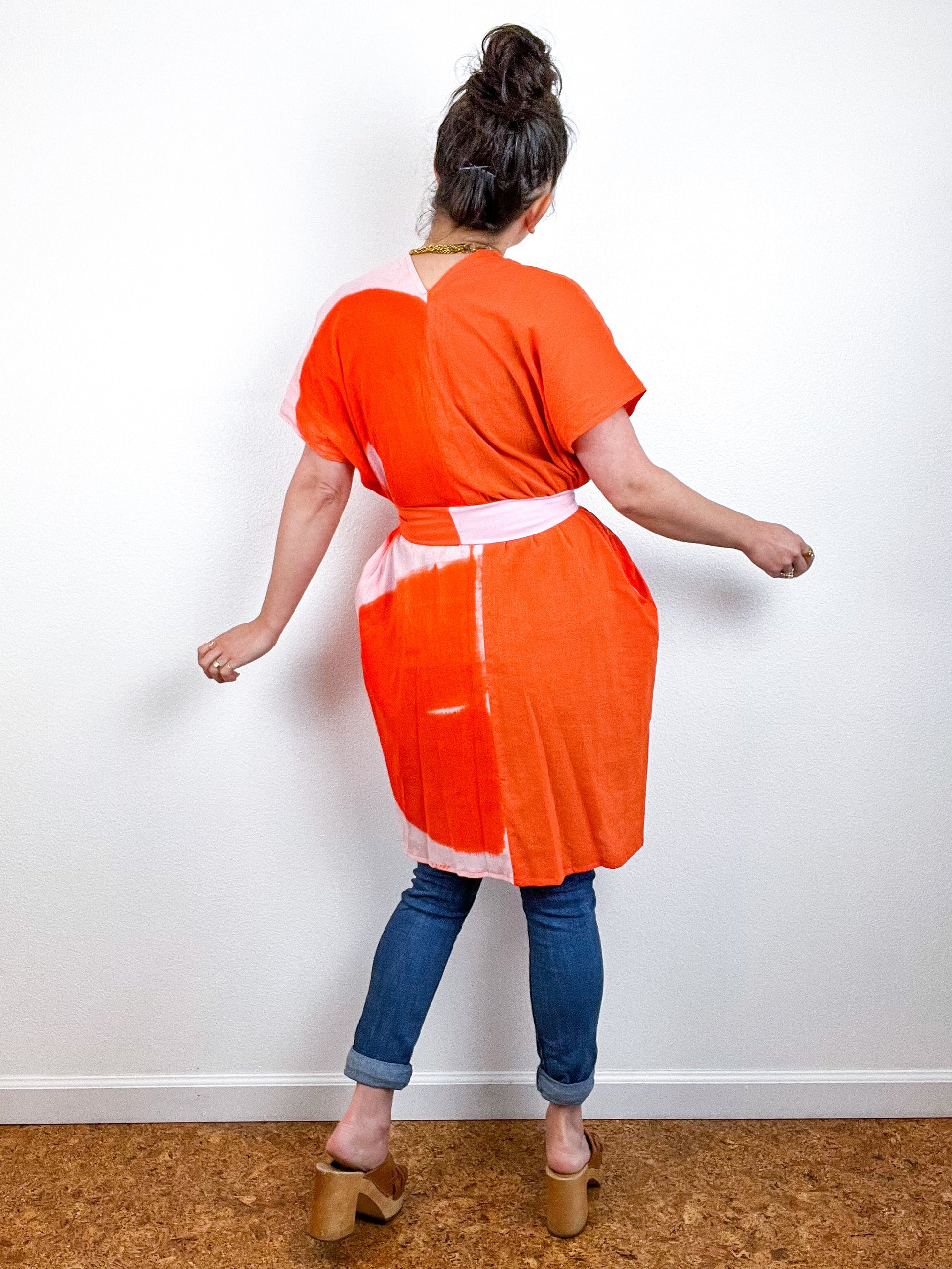 Single gauze caftan dress with an oversized silhouette, slightly tapered hem and nice deep pockets. Can be worn with included tie for a defined waist, or without for a more comfy look. Versatile shape can be styled as a dress or tunic over jeans or leggings. The minimalist design created from full rectangles of fabric produces little to no material waste. Lightweight 100% cotton single gauze fabric is hand-dyed solid orange on one side and blush with orange brushstrokes on the other.