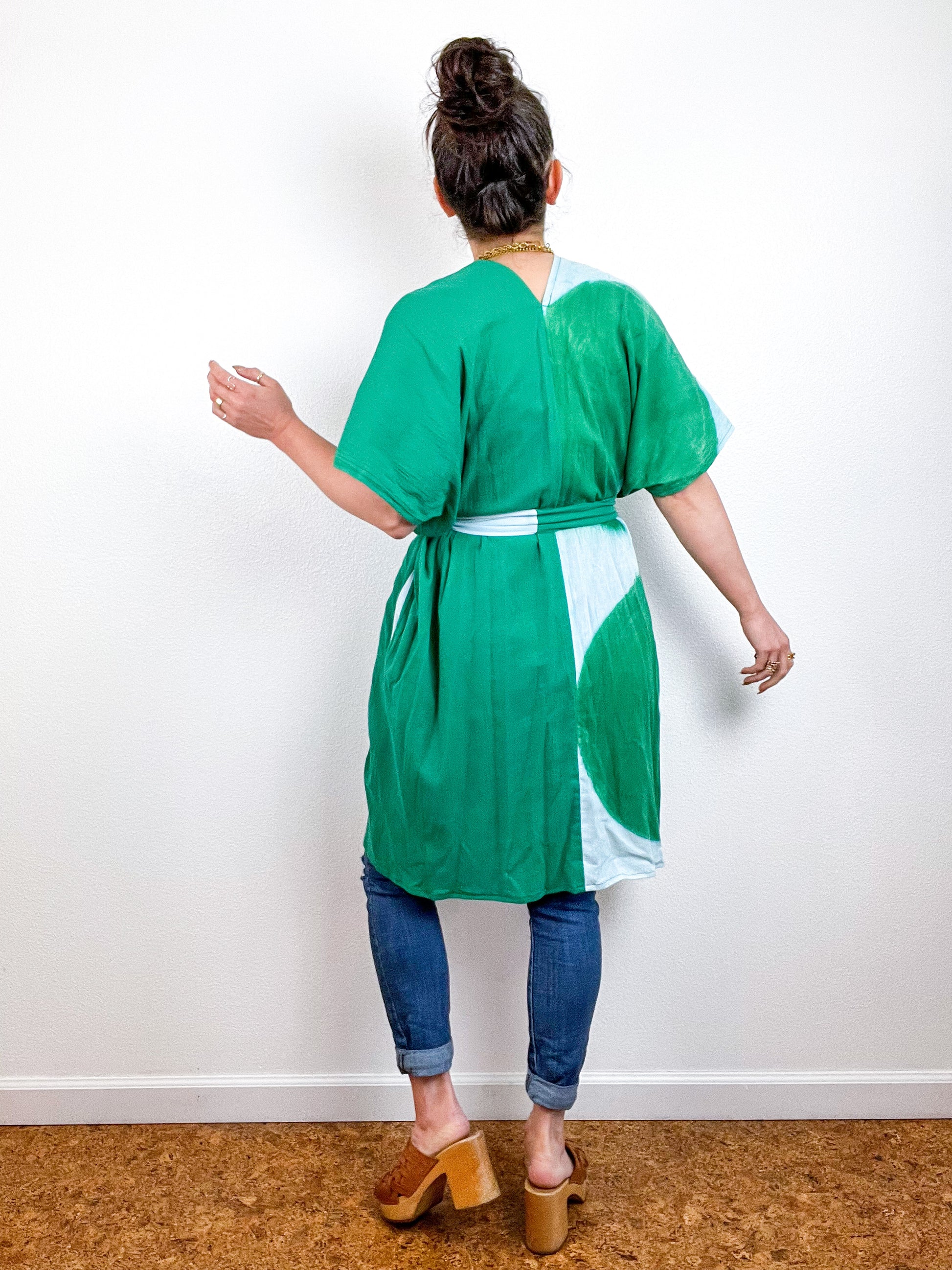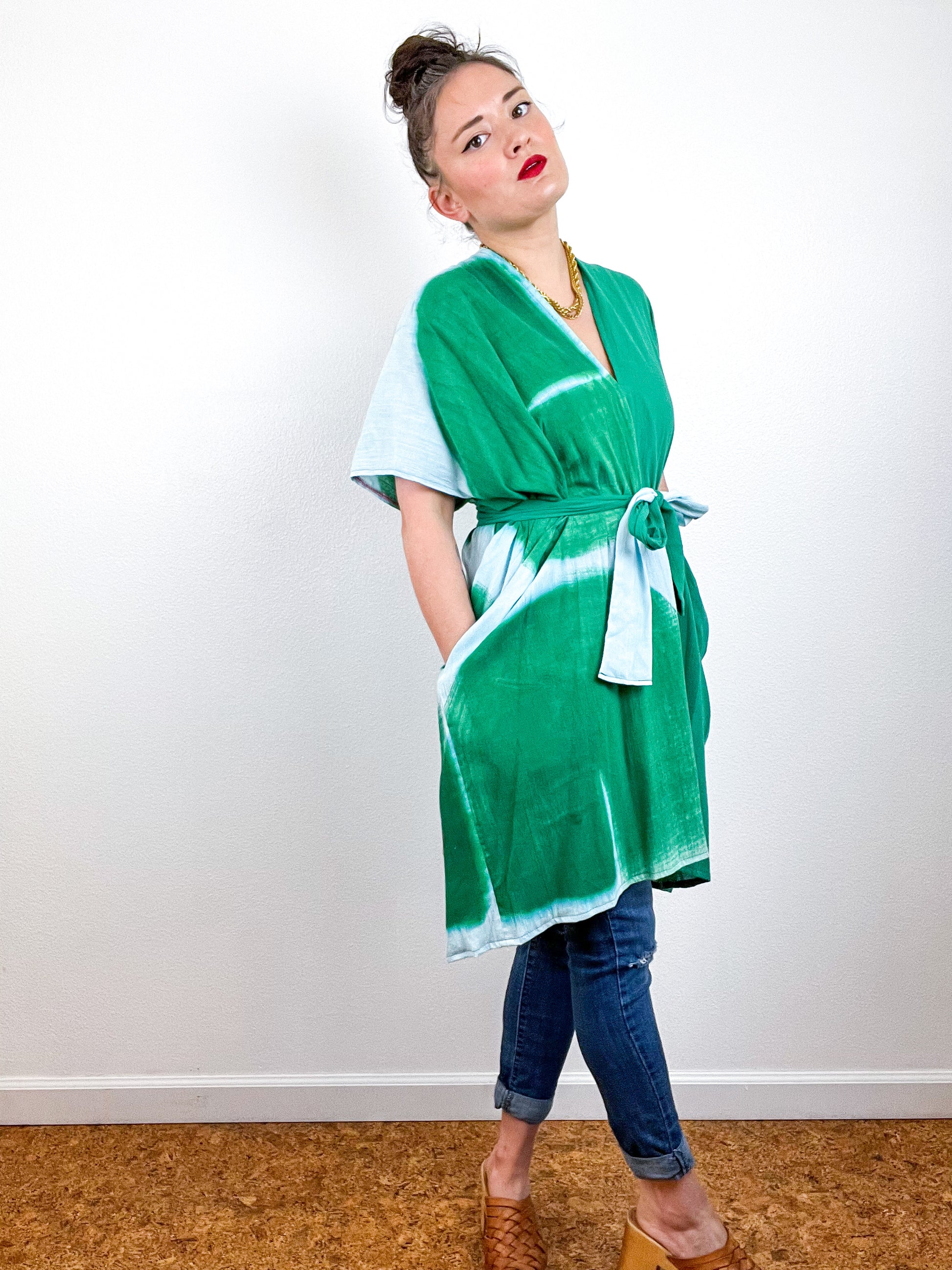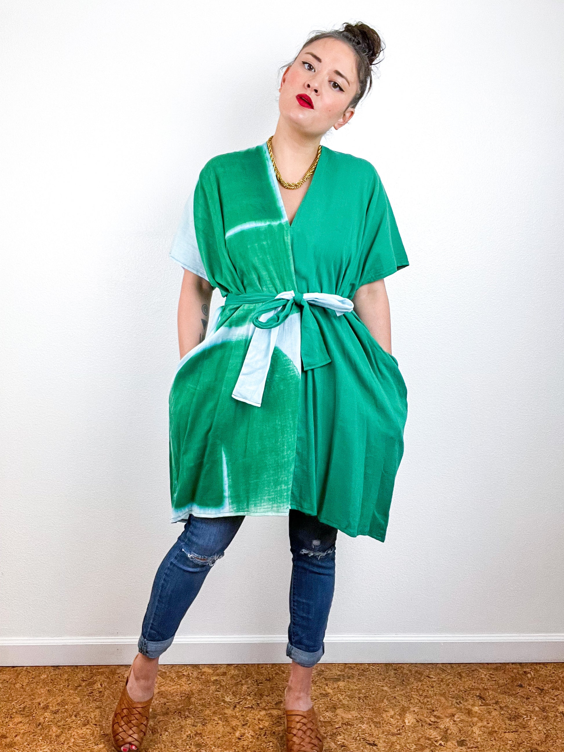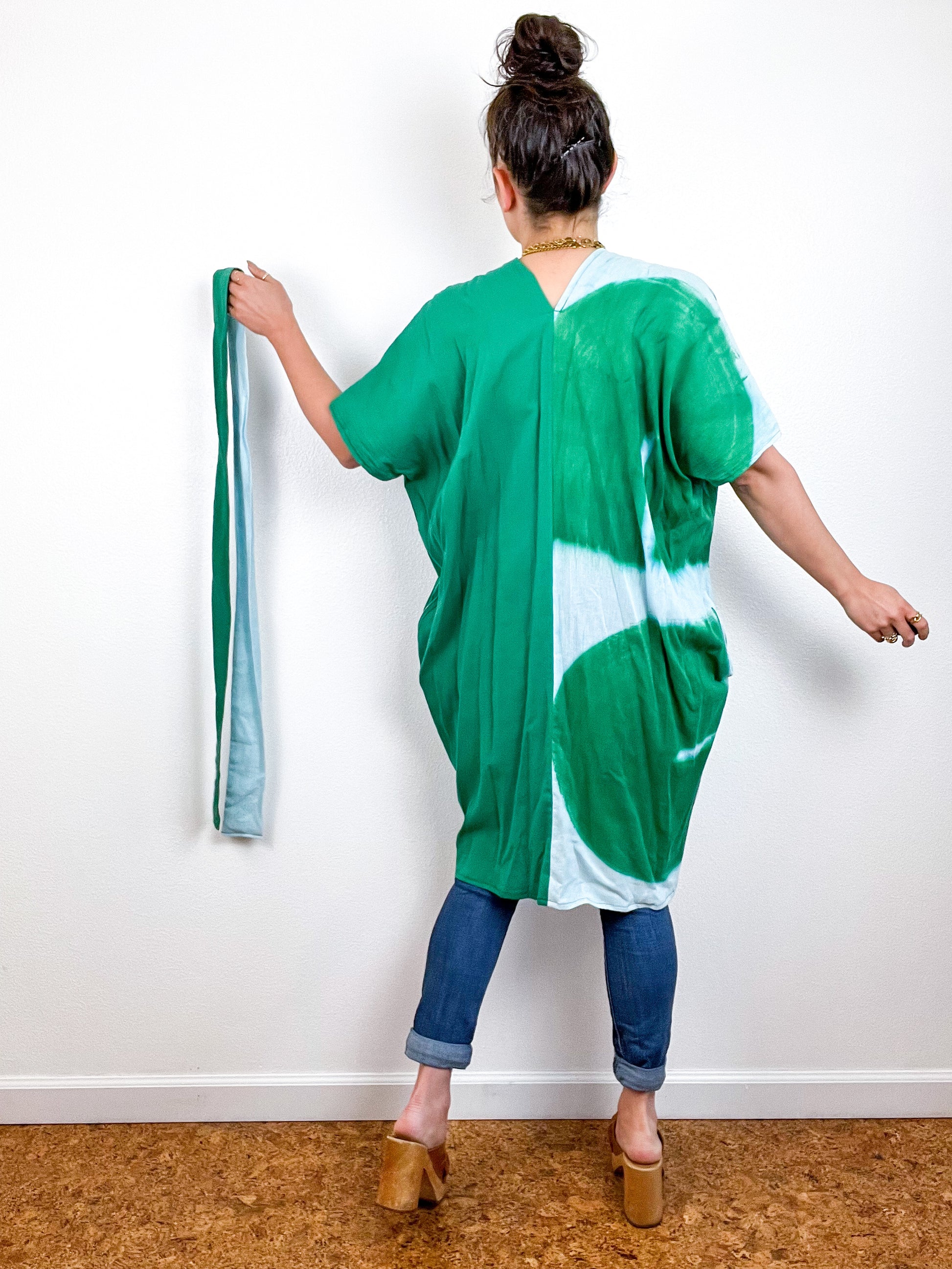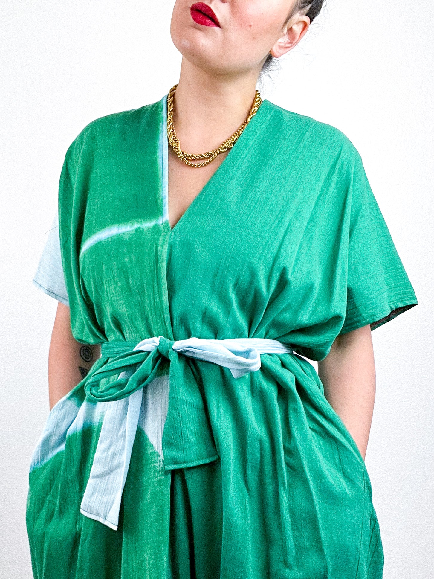 Single gauze caftan dress with an oversized silhouette, slightly tapered hem and nice deep pockets. Can be worn with included tie for a defined waist, or without for a more comfy look. Versatile shape can be styled as a dress or tunic over jeans or leggings. The minimalist design created from full rectangles of fabric produces little to no material waste. Lightweight 100% cotton single gauze fabric is hand-dyed solid Kelly green on one side and aqua with green brushstrokes on the other.