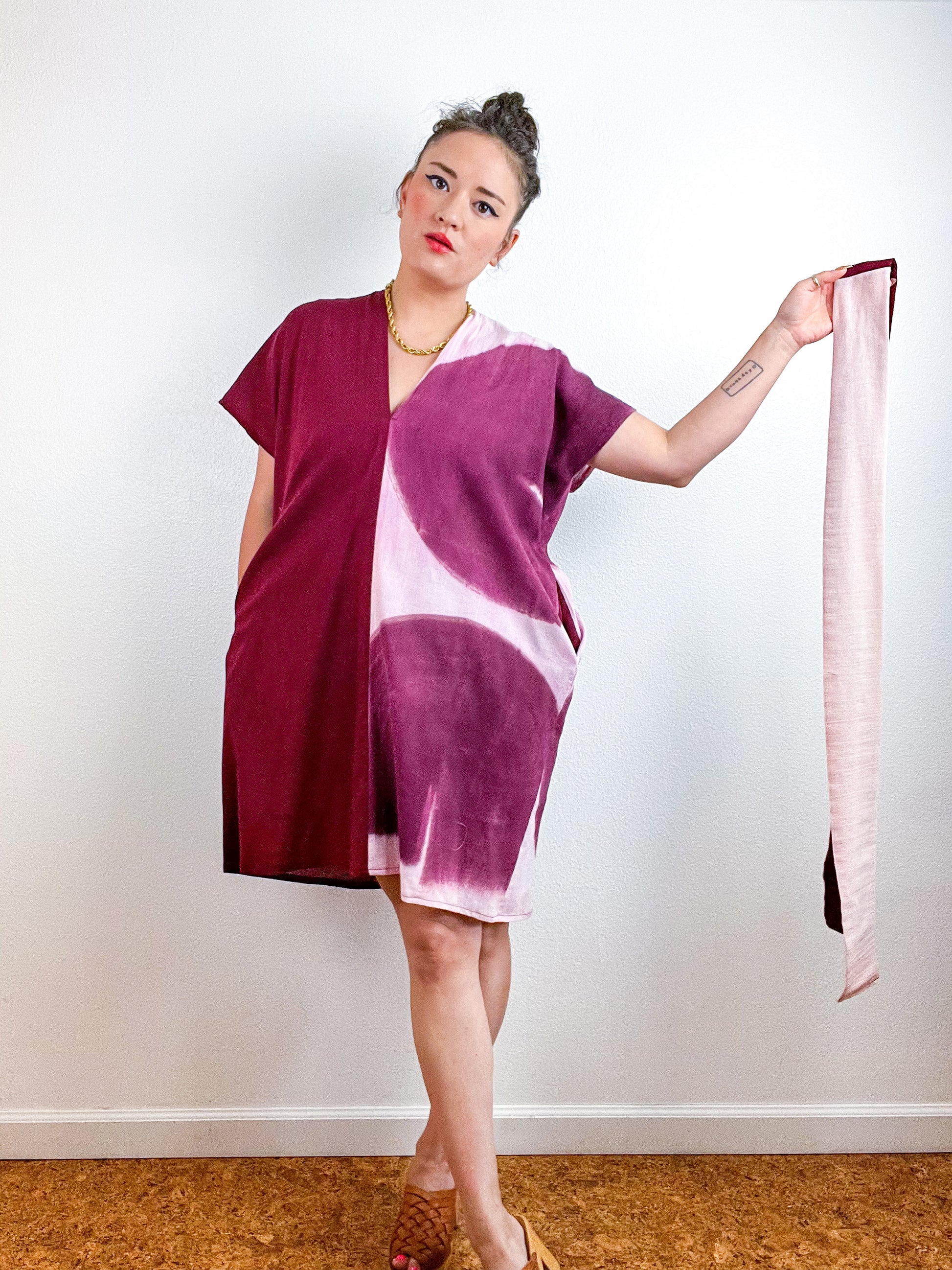 Single gauze caftan dress with an oversized silhouette, slightly tapered hem and nice deep pockets. Can be worn with included tie for a defined waist, or without for a more comfy look. Versatile shape can be styled as a dress or tunic over jeans or leggings. The minimalist design created from full rectangles of fabric produces little to no material waste. Lightweight 100% cotton single gauze fabric is hand-dyed solid blush on one side and blush with maroon brushstrokes on the other.