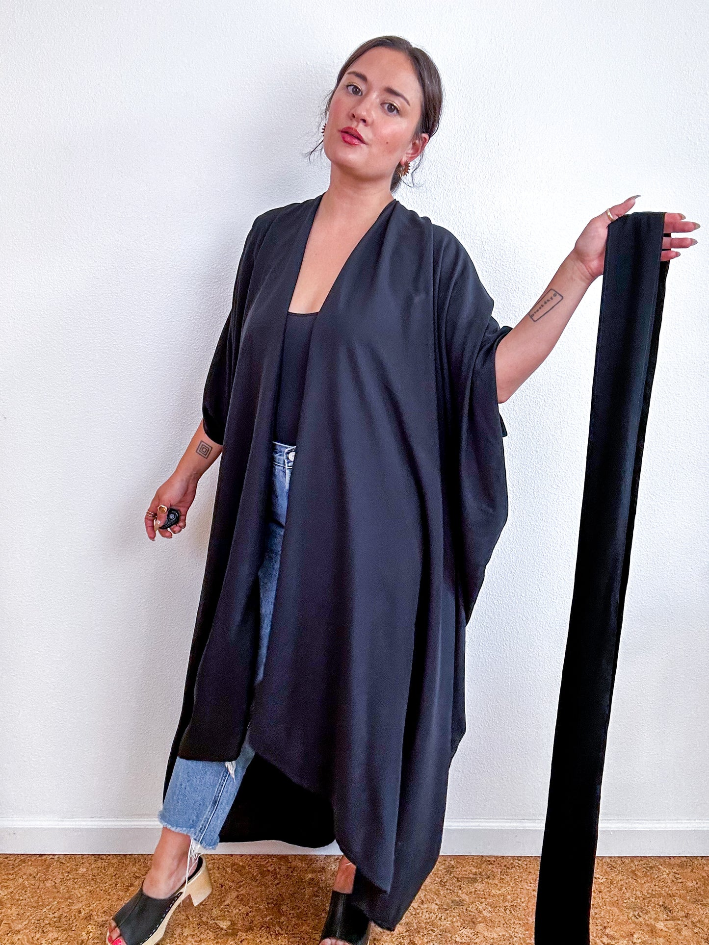 Light and airy kimono with a flowing silhouette, selvage sleeve detail, curved high low hem and optional waist tie. Versatile shape can be styled as a wrap dress, lightweight jacket over jeans, swimsuit coverup, or an elegant robe over lingerie. The minimalist design created from a full rectangle of fabric drapes beautifully over the shoulders and produces little to no material waste by utilizing one whole piece of fabric without scraps from corners and irregular cuts. Solid black rayon challis fabric with a smooth matte surface.