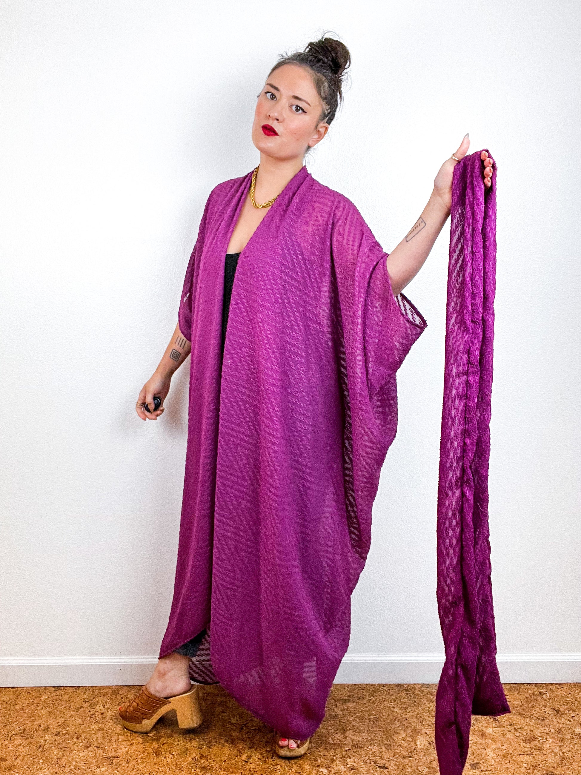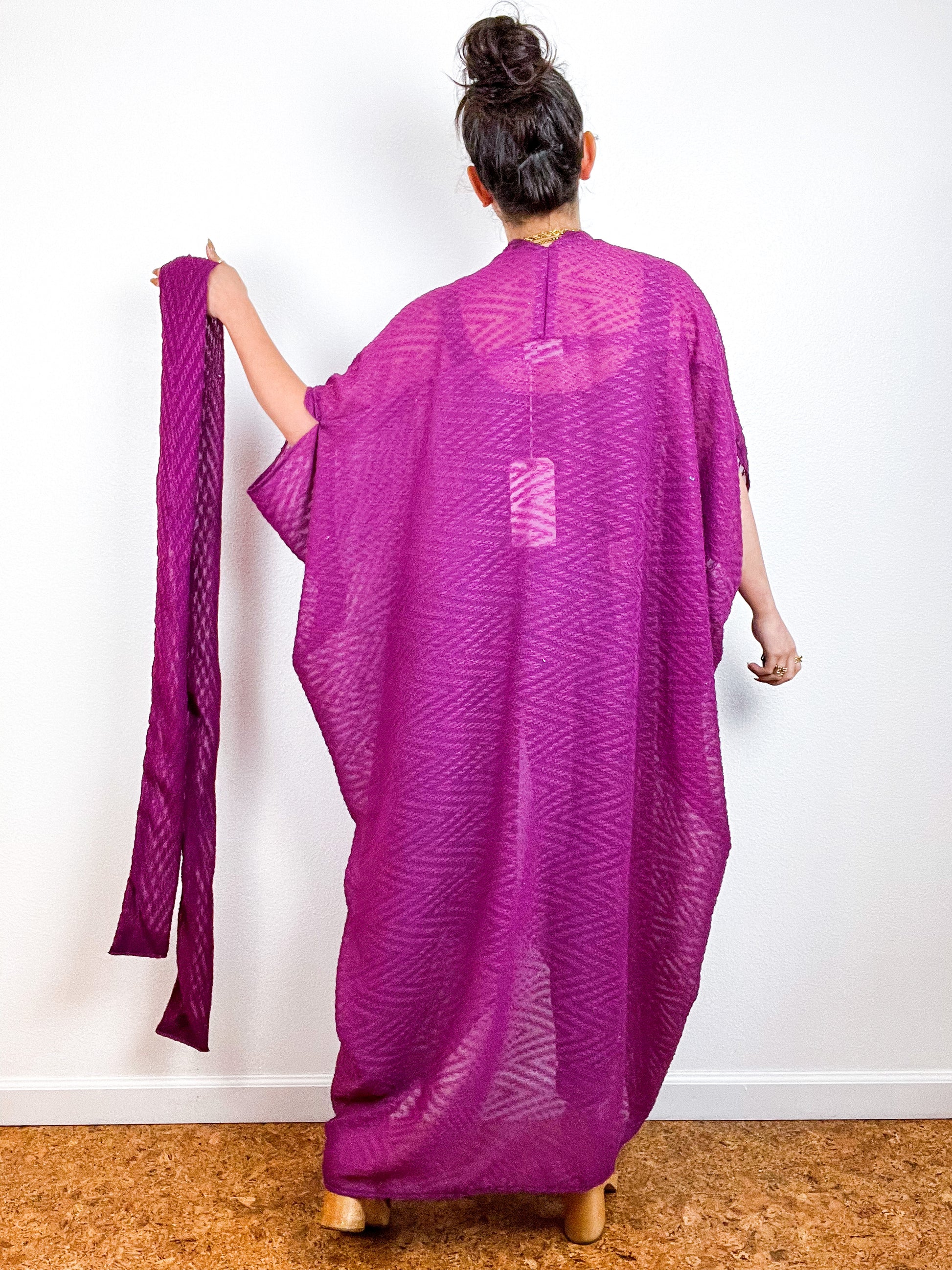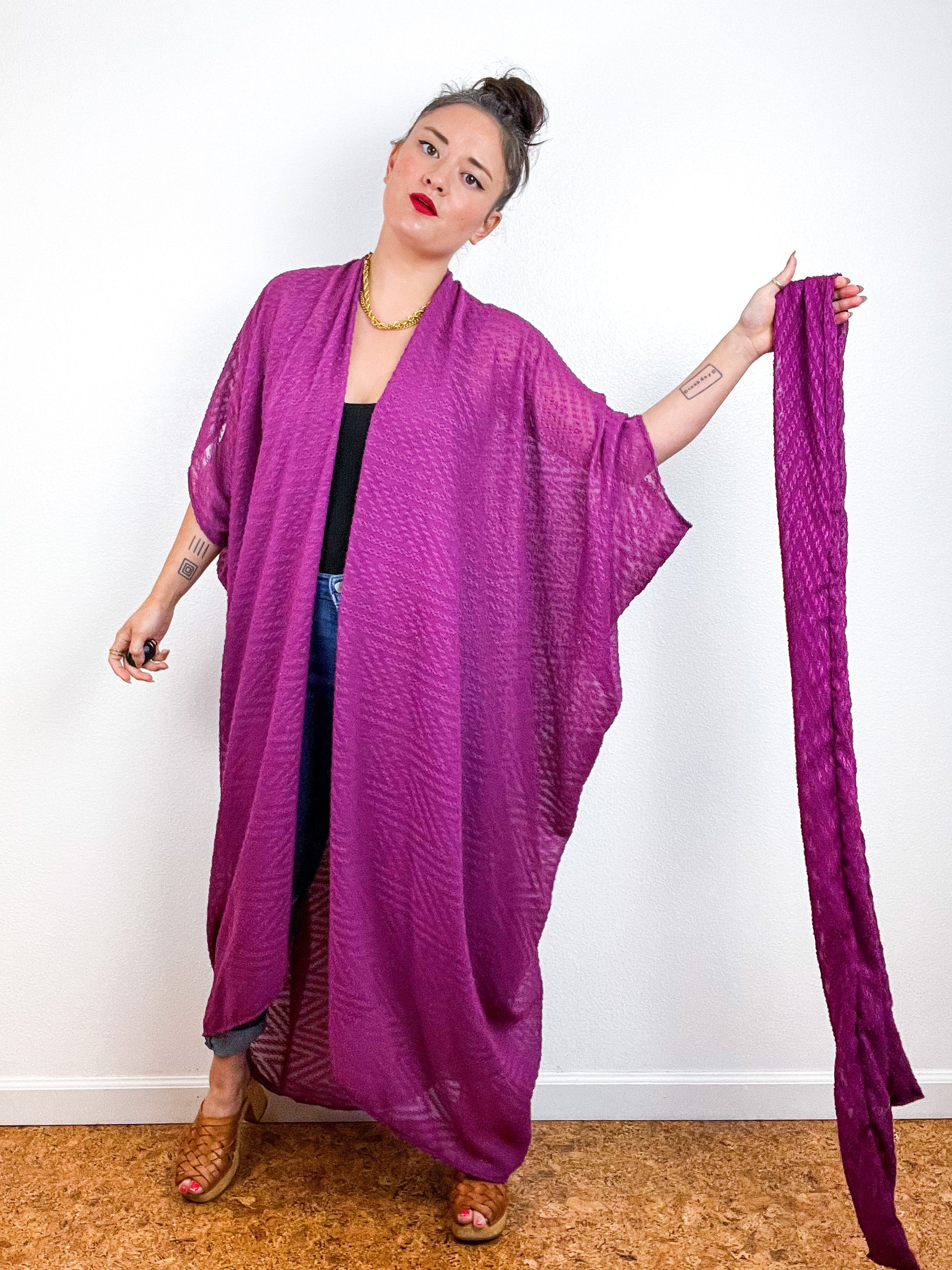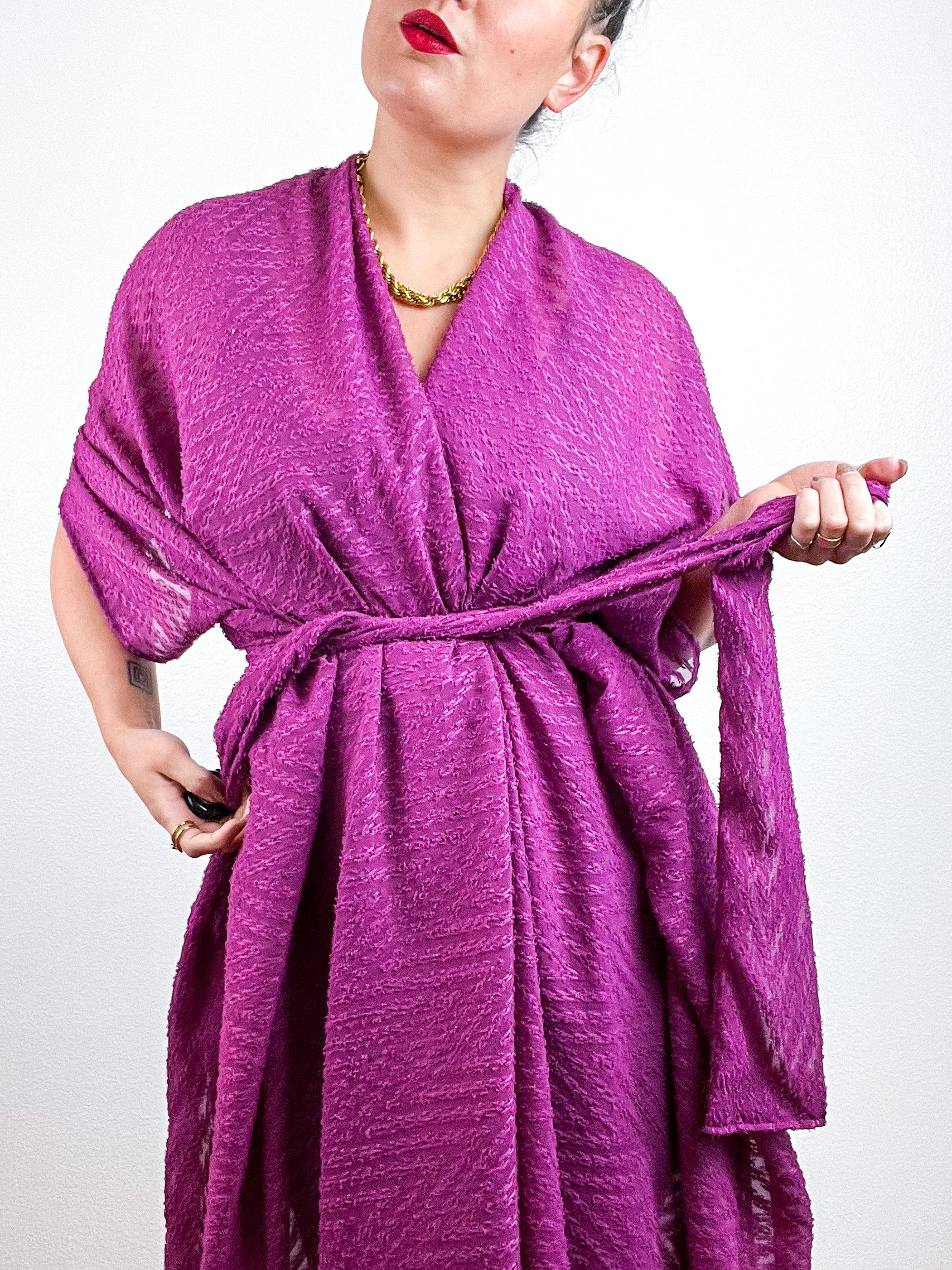 Light and airy kimono with a flowing silhouette, tulip sleeve detail, curved high low hem and optional waist tie. Versatile shape can be styled as a wrap dress, lightweight open layer, swimsuit coverup, or an elegant robe over lingerie. The minimalist design created from a full rectangle of fabric drapes beautifully over the shoulders and produces little to no material waste by utilizing one whole piece of fabric without scraps from corners and irregular cuts. Solid magenta textured chevron chiffon fabric with a sheer, matte finish.