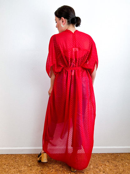 Light and airy kimono with a flowing silhouette, tulip sleeve detail, curved high low hem and optional waist tie. Versatile shape can be styled as a wrap dress, lightweight open layer, swimsuit coverup, or an elegant robe over lingerie. The minimalist design created from a full rectangle of fabric drapes beautifully over the shoulders and produces little to no material waste by utilizing one whole piece of fabric without scraps from corners and irregular cuts. Solid red sheer chiffon fabric with a Swiss dot texture.